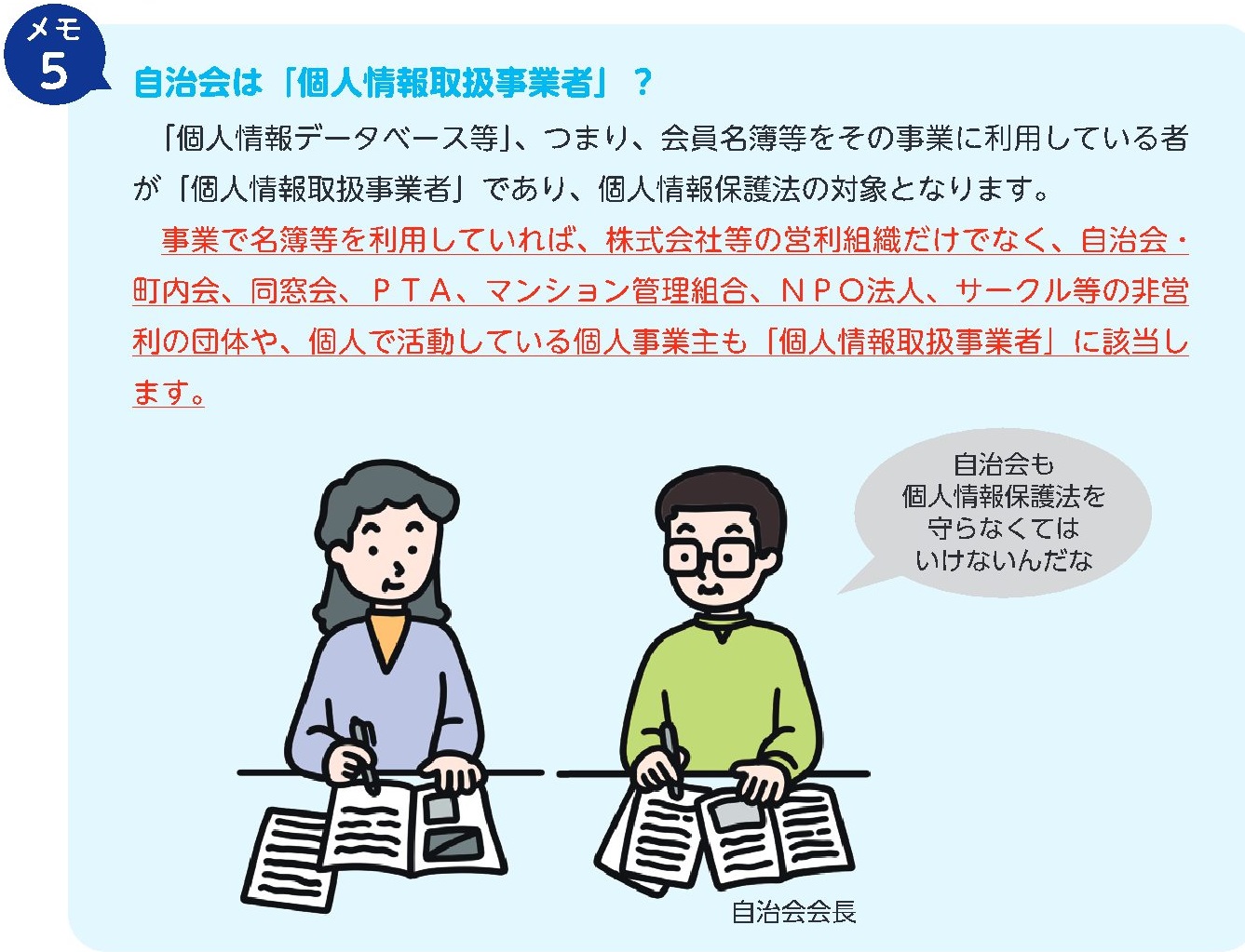 このパンフの4ページには ” 自治会は「個人情報取り扱い事業者」? ” に、同窓会も該当することが明記されています。